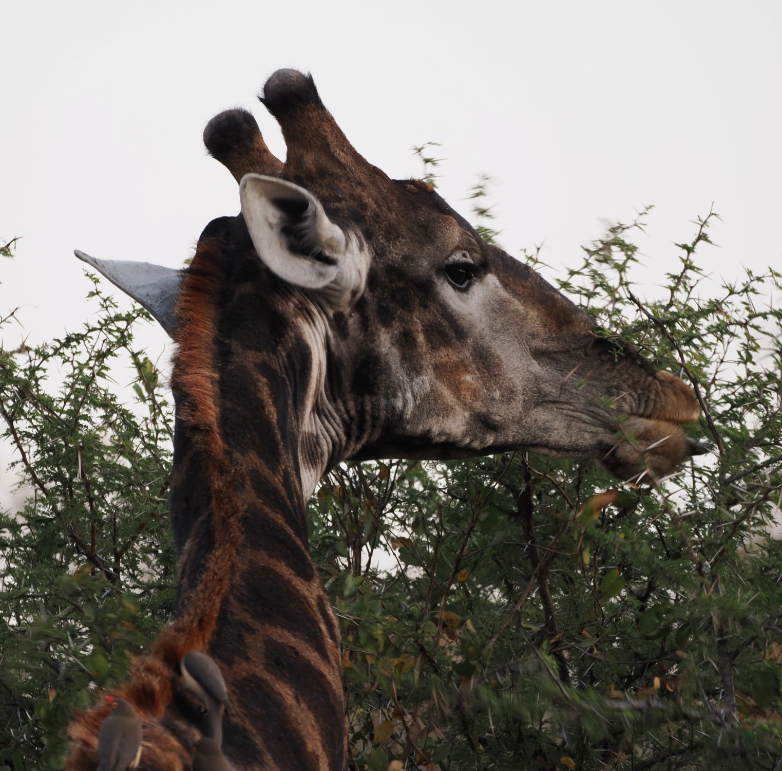 This was my first sighting of Southern yellow-billed hornbills (Tockus leucomelas), a common sight around the Greater Kruger area of South Africa. These medium-sized birds are distinctive for their long, curved bill, their powerful, controlled gliding from branch to ground, and their significant time spent walking about on the ground. I often observed yellow-billed hornbills turning over leaves and flipping up sand with those magnificent beaks, foraging for the invertebrates that are the mainstay of their diet. Although this was the only hornbill species I observed, there are several hornbill species present here in winter, including the Southern yellow-billed hornbill, Southern red-billed hornbill (with a slightly higher pitched call), and the much larger Southern ground hornbill (with its banjo-string vocalizations).