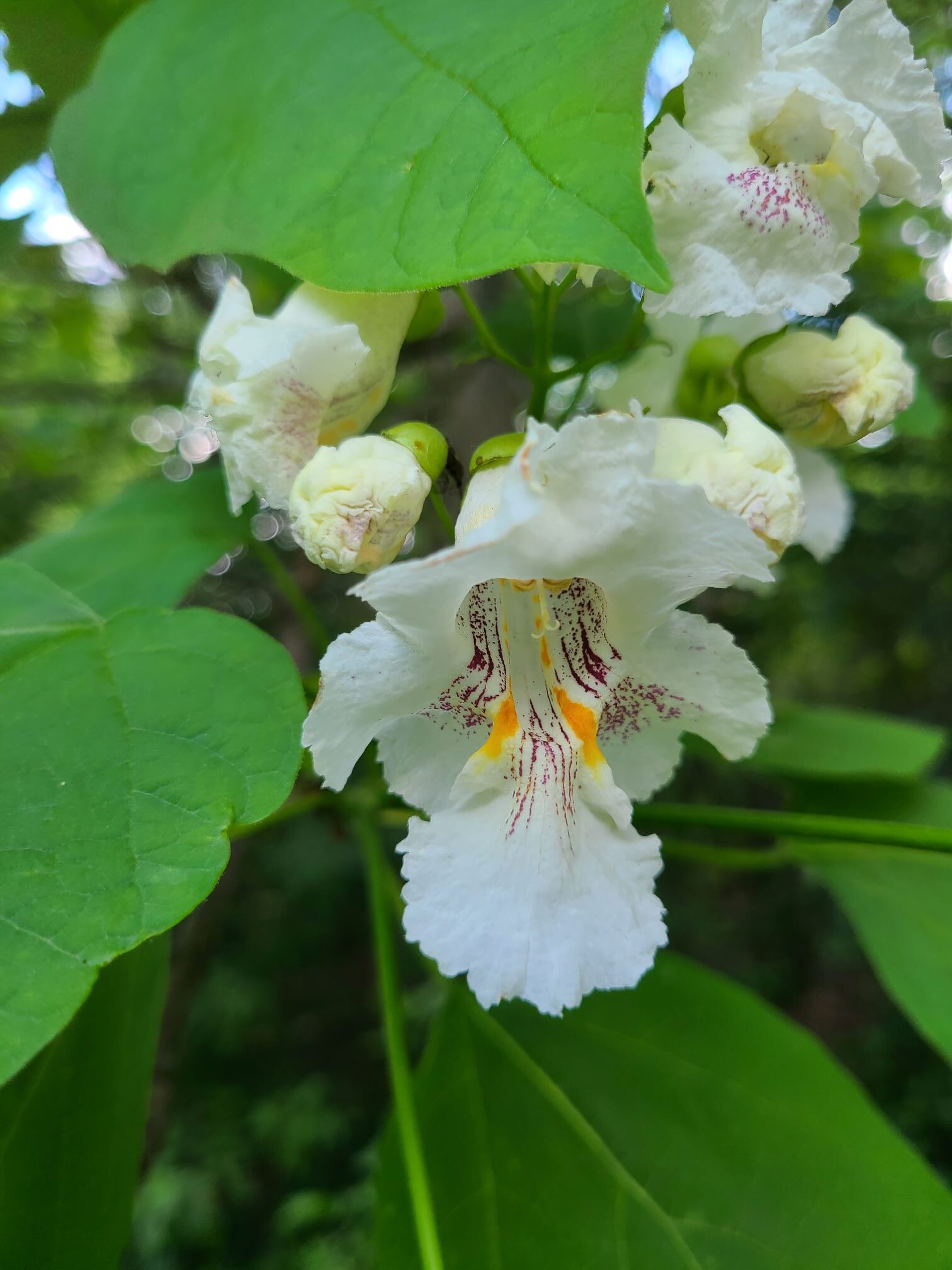 - Showy catalpa blossoms waft a honeyed fragrance along a nearby street in late spring.