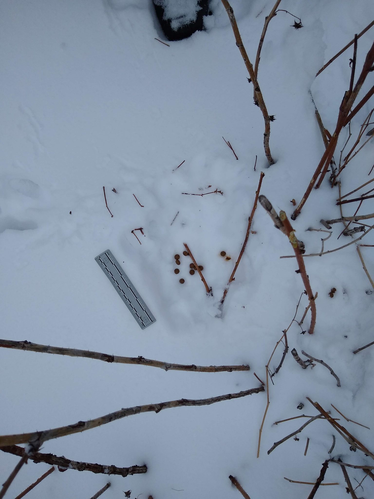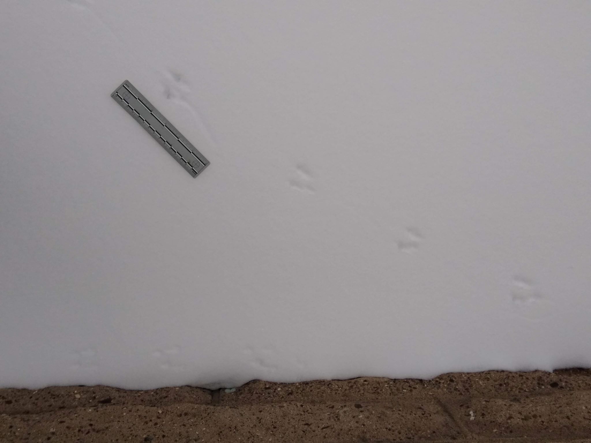 - Signs of rabbit presence in my backyard: tracks, body print, freshly nipped raspberry canes, and freshly deposited scat!